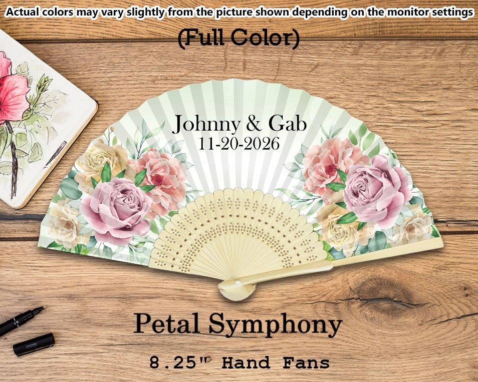 - Each personalized silk fan measures 8.25" long x 15" wide (when fully opened)