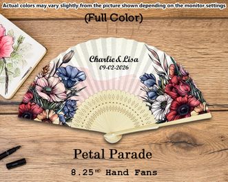 These Personalized Wedding Silk Fans bloom so grand with their floral designs. And, perfected, of course, with your names and wedding date. The most fantastic gift for your guest on your special occasion that celebrates your love in style, these personalized silk wedding fans are perfect for your outdoor ceremony or as a charming touch for your reception. Features: